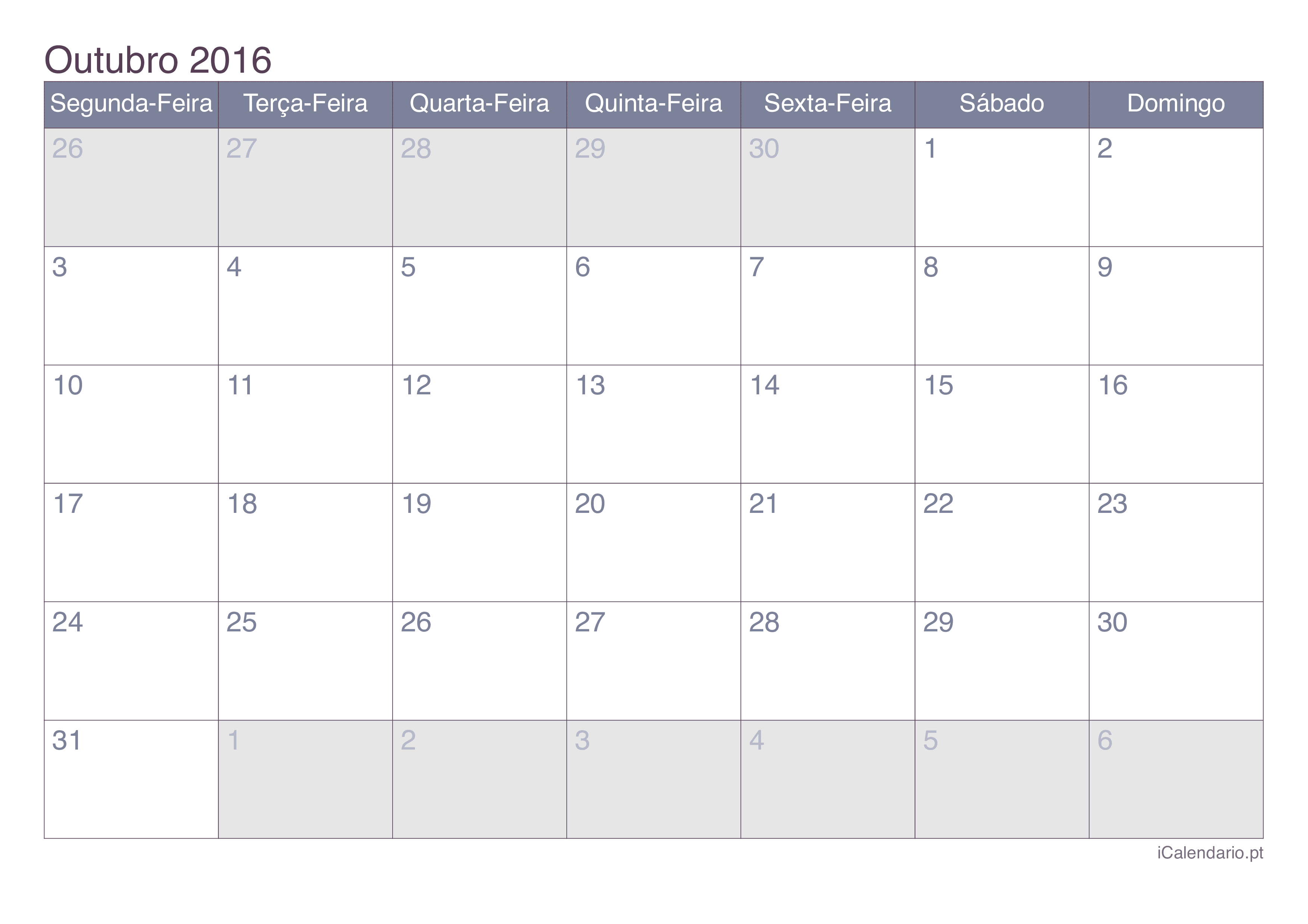 Você pode baixar e imprimir à vontade o calendário em branco do mês de outubro 2016, com espaço para anotações, disponível nos formatos de imagem, PDF e Excel. Você encontrará também, outros temas para o calendário de outubro 2016.