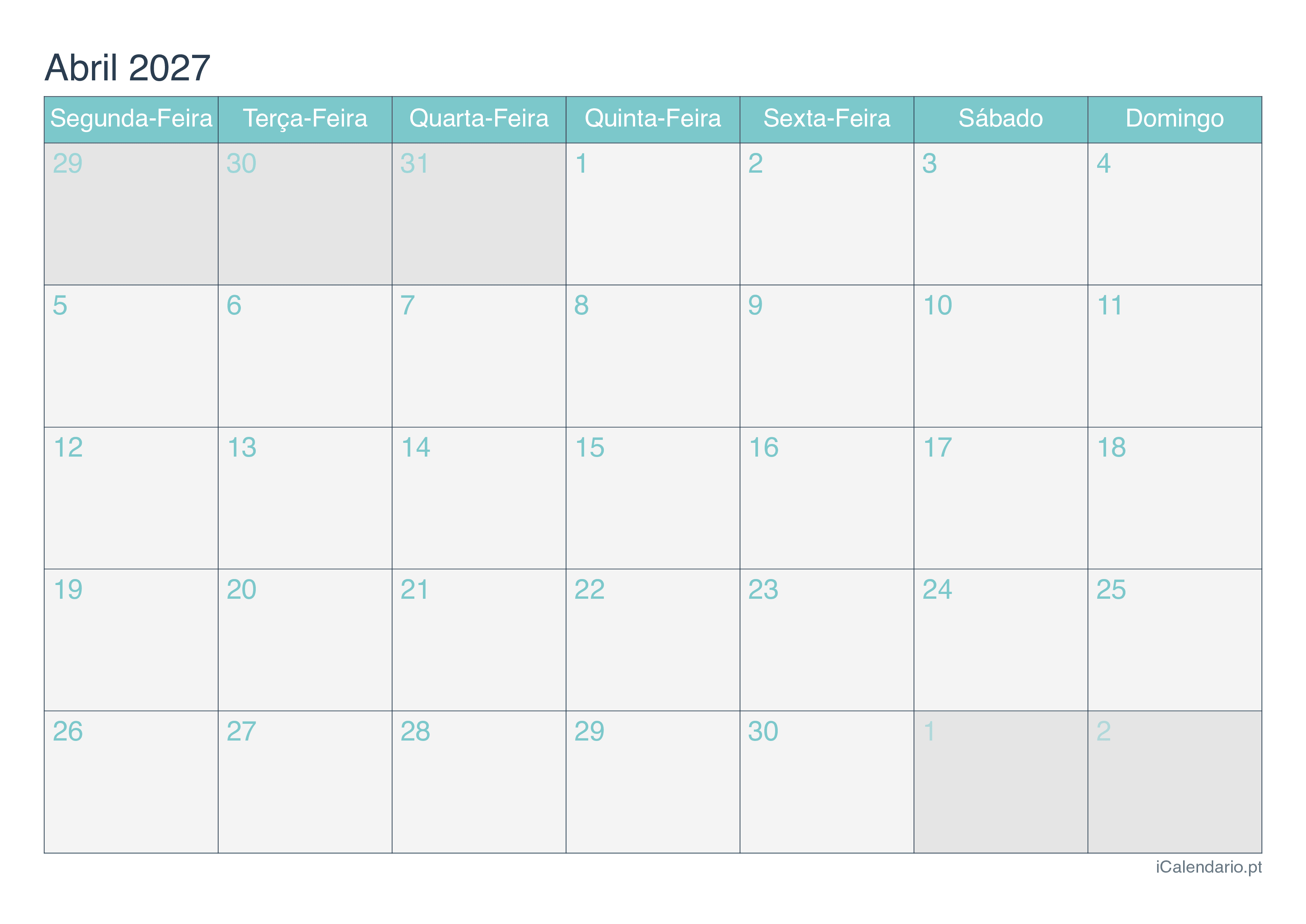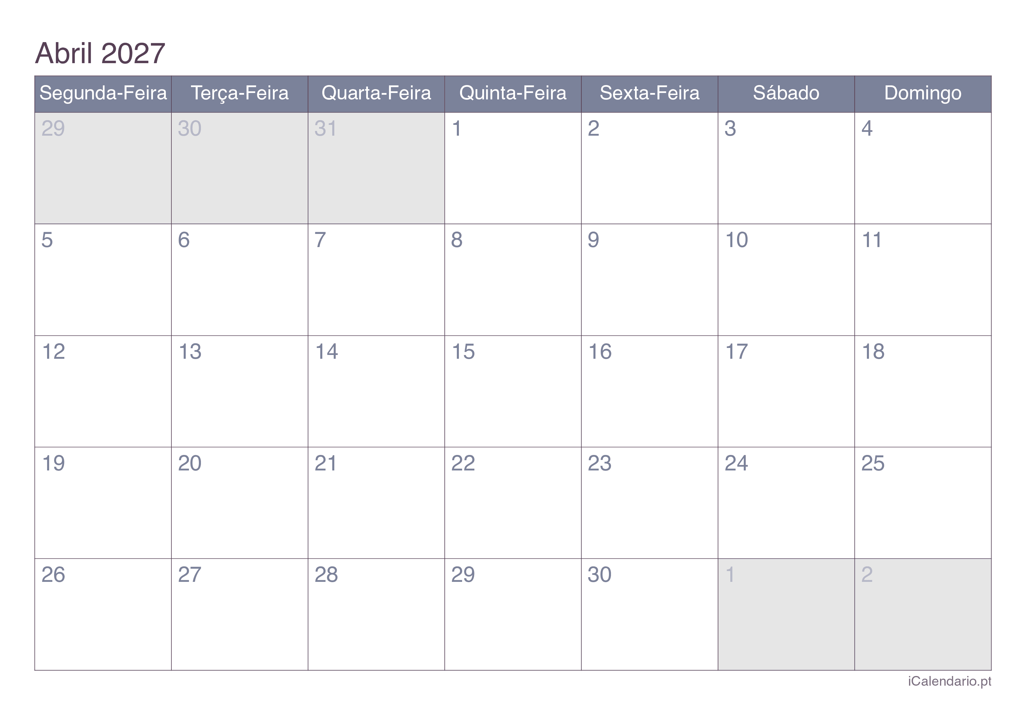 Você pode baixar e imprimir à vontade o calendário em branco do mês de abril 2027, com espaço para anotações, disponível nos formatos de imagem, PDF e Excel. Você encontrará também, outros temas para o calendário de abril 2027.
