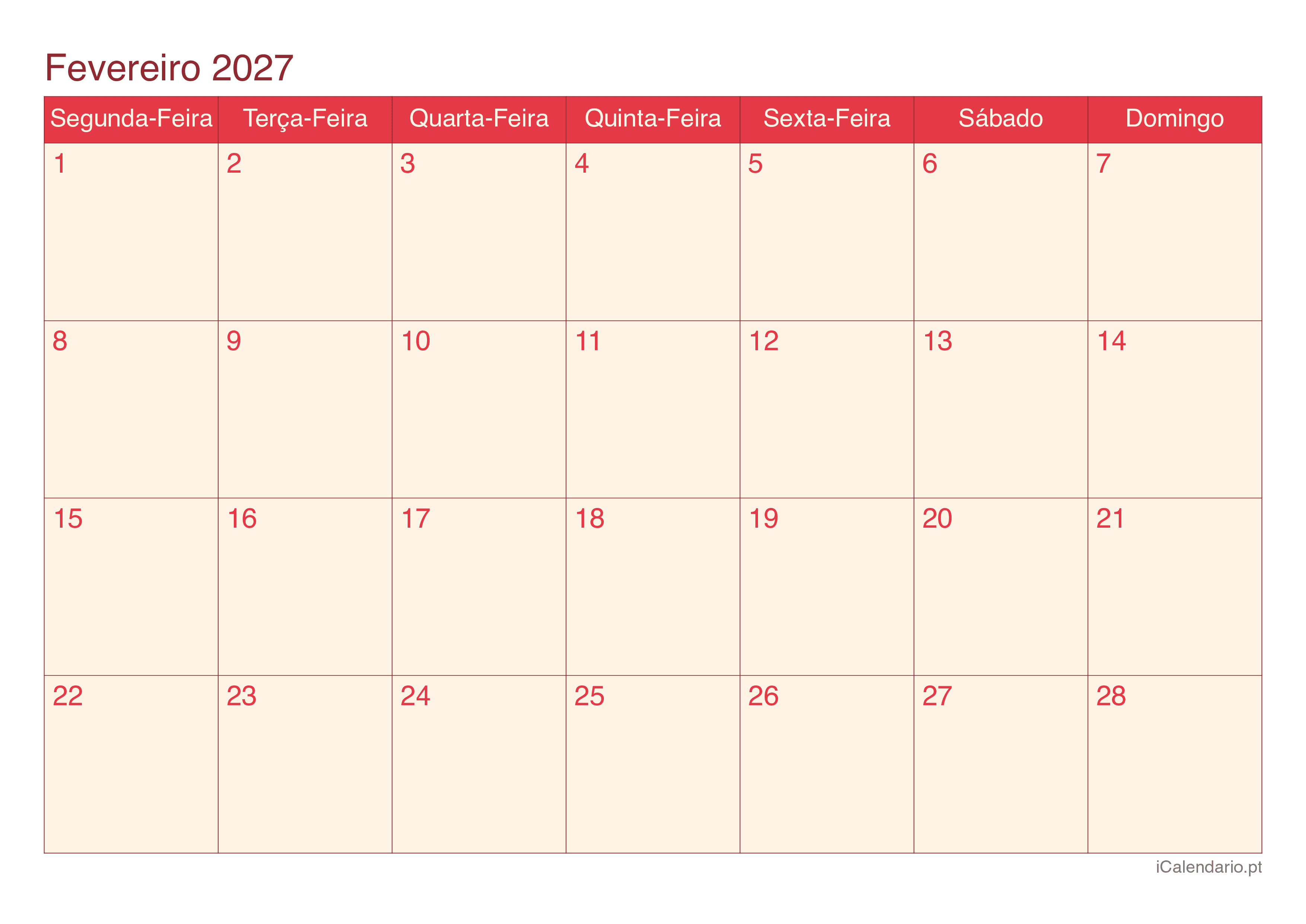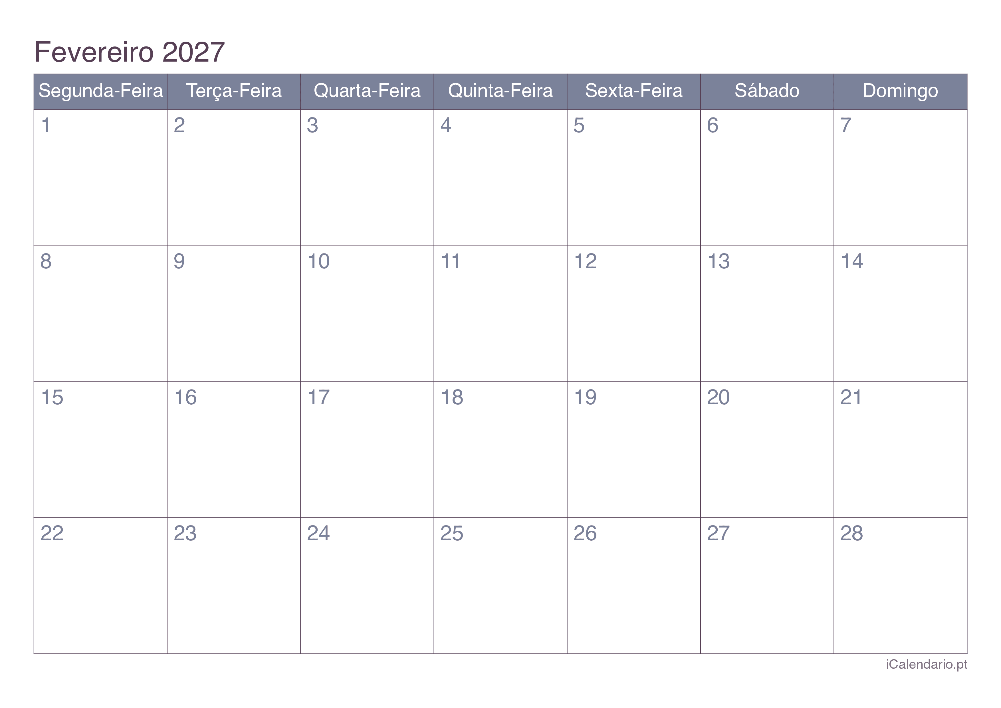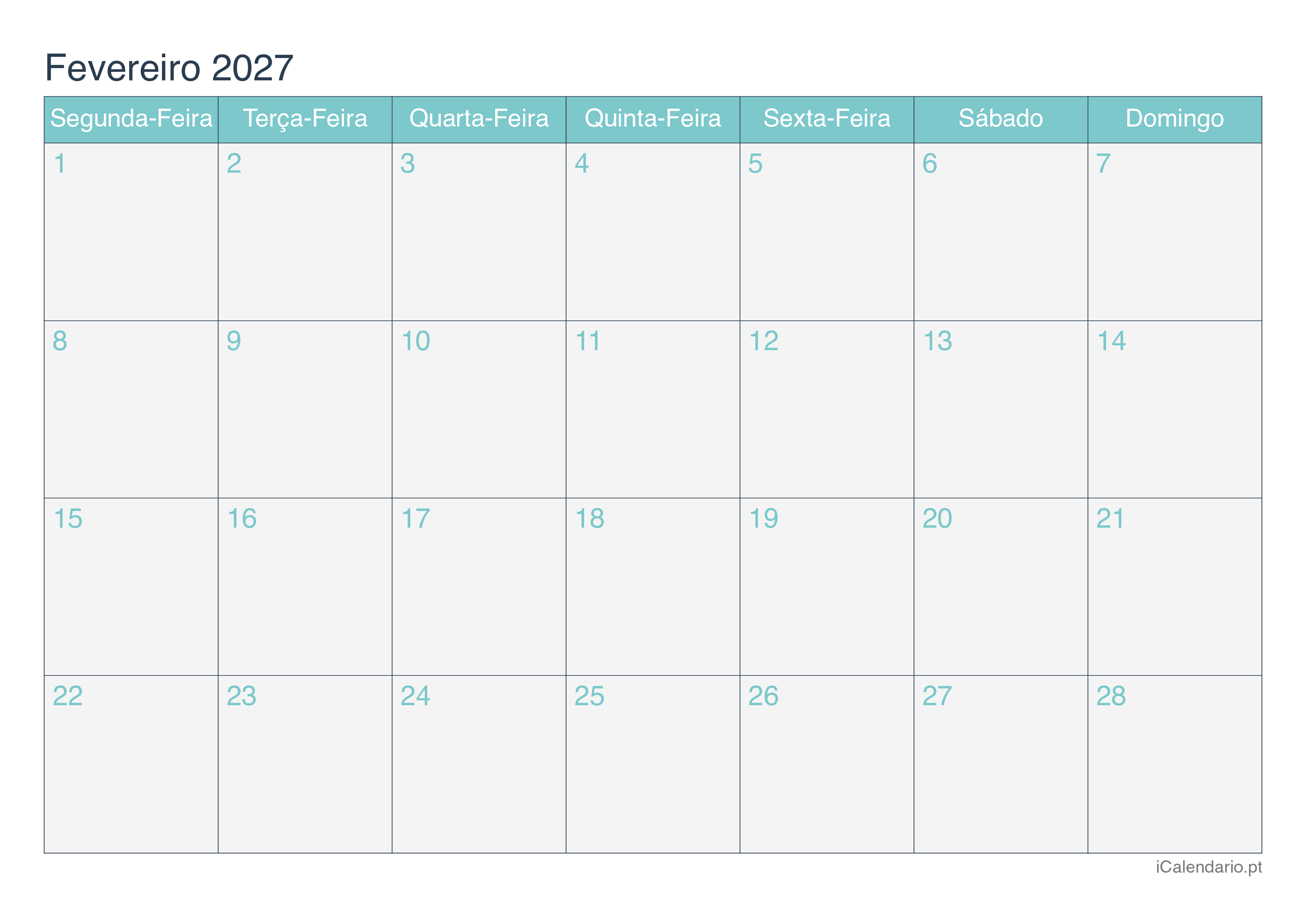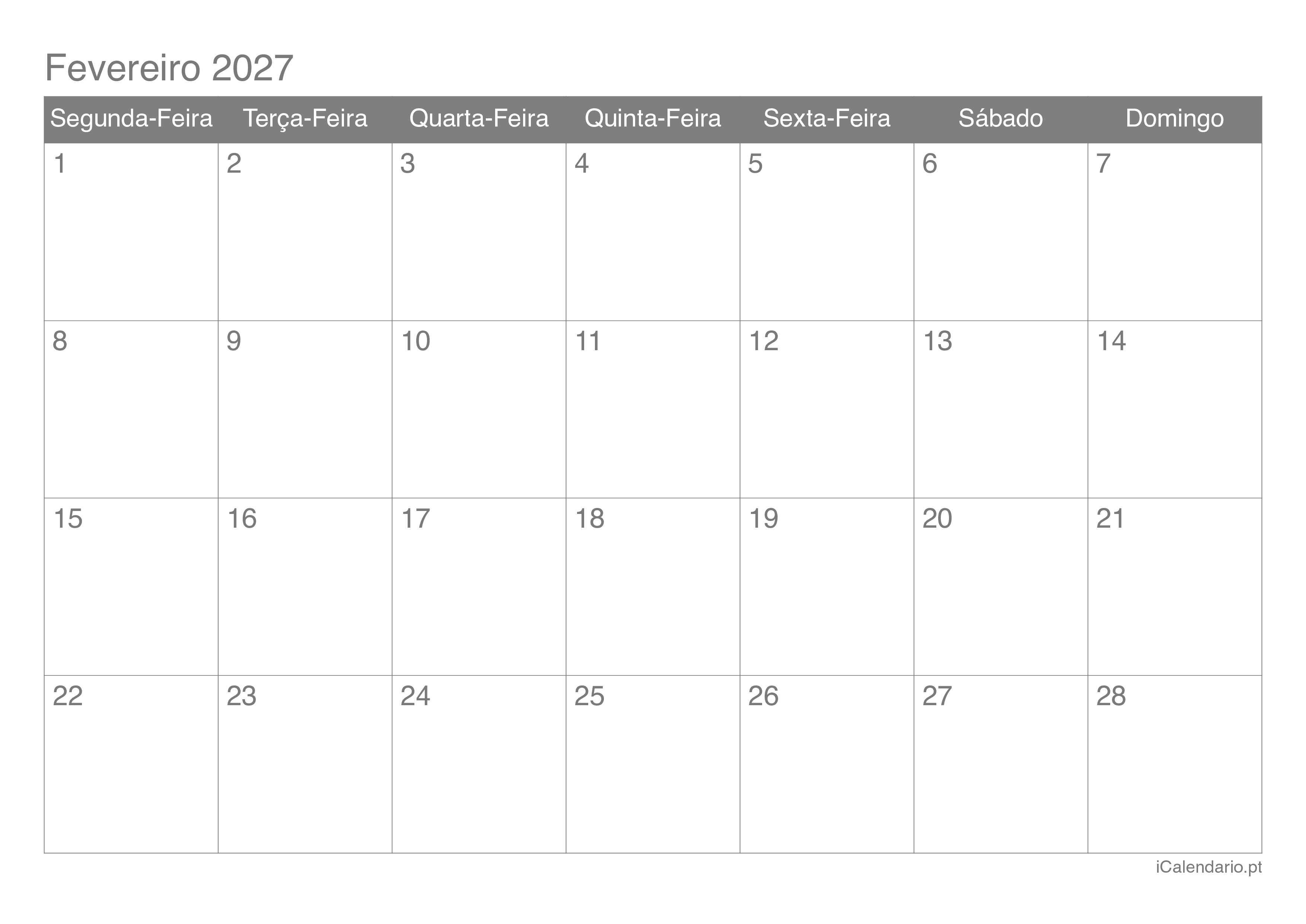 Você pode baixar e imprimir à vontade o calendário em branco do mês de fevereiro 2027, com espaço para anotações, disponível nos formatos de imagem, PDF e Excel. Você encontrará também, outros temas para o calendário de fevereiro 2027.
