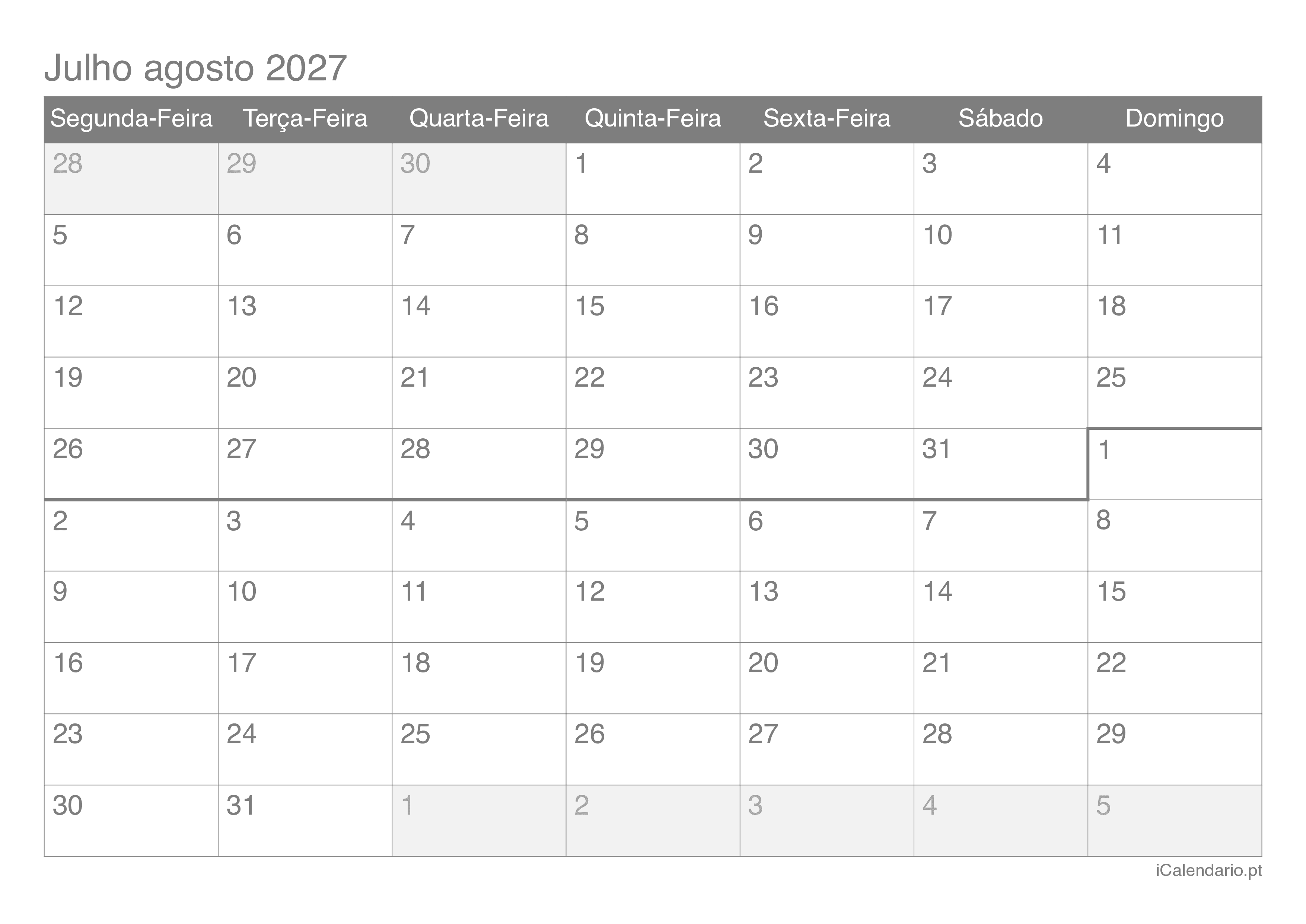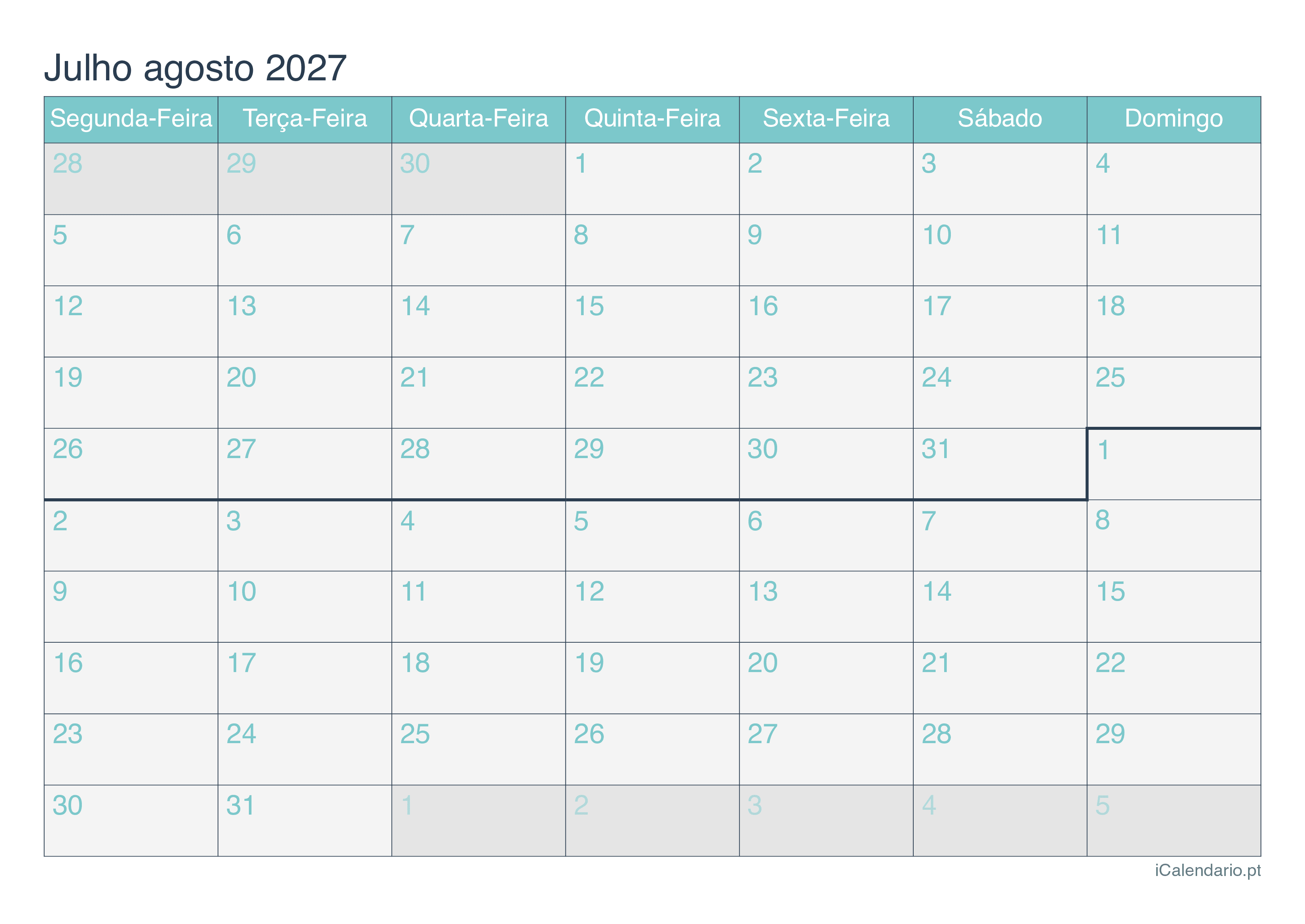 Você pode baixar e imprimir à vontade o calendário em branco do mês de julho e agosto 2027, com espaço para anotações, disponível nos formatos de imagem, PDF e Excel. Você encontrará também, outros temas para o calendário de julho e agosto 2027.