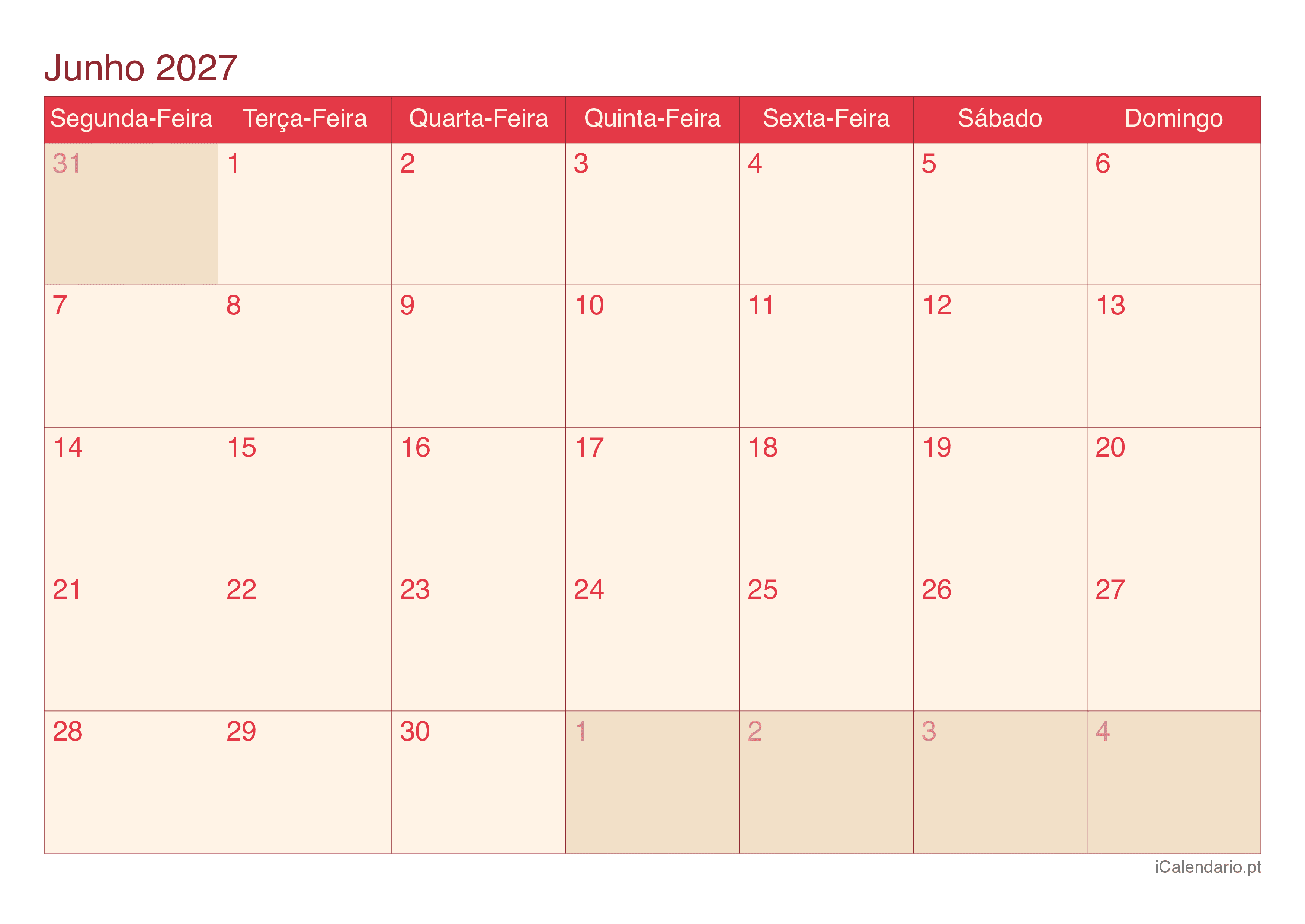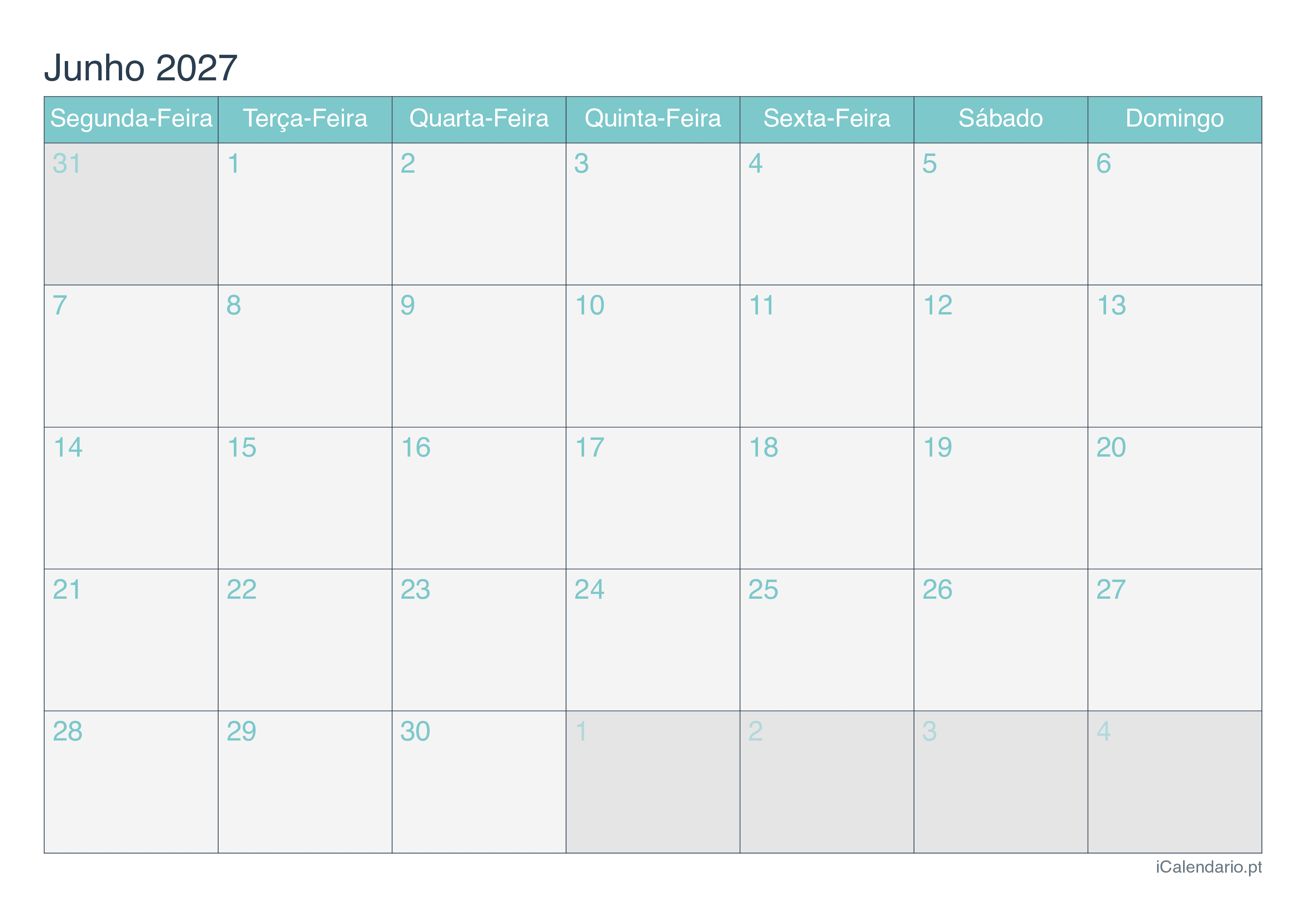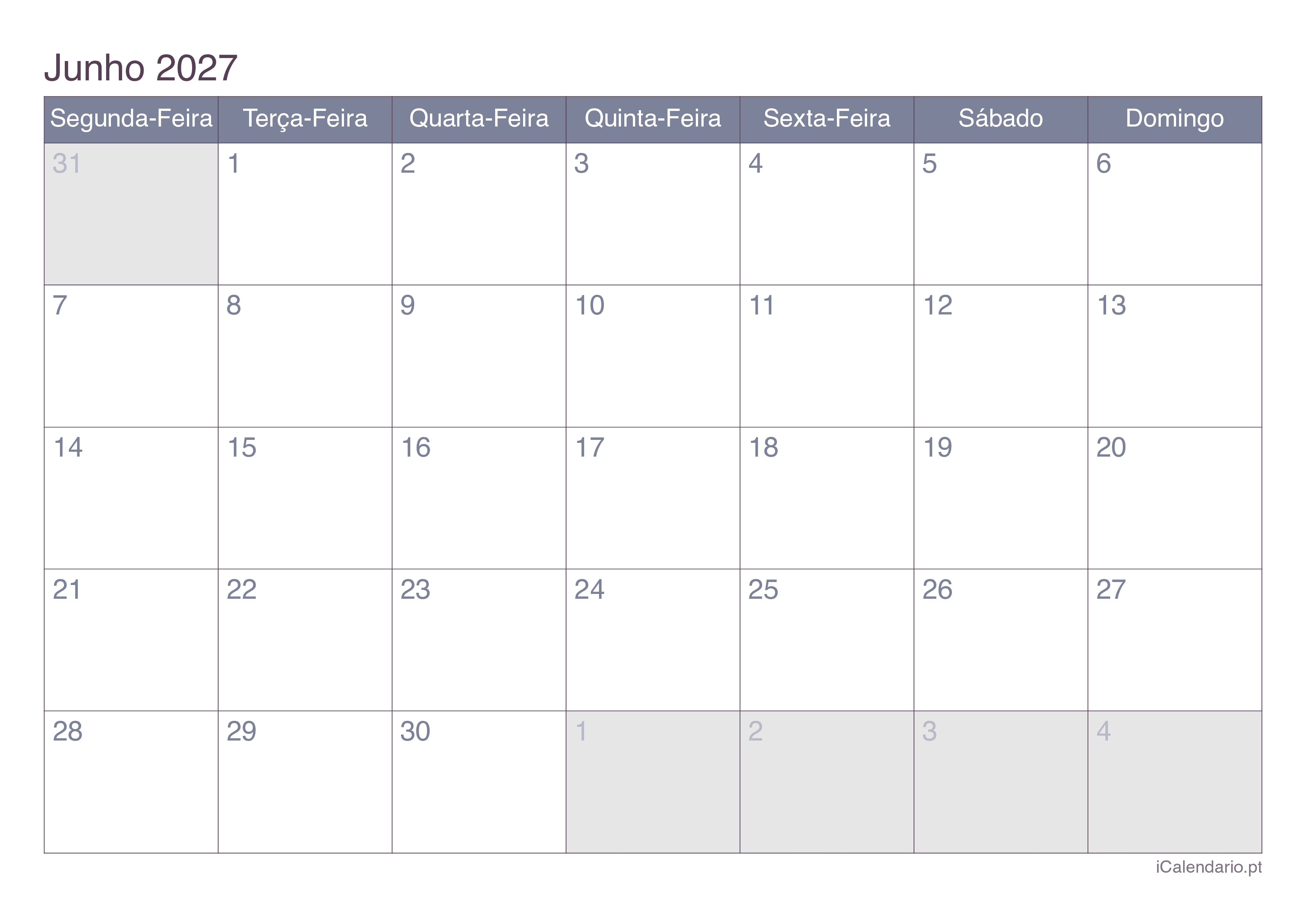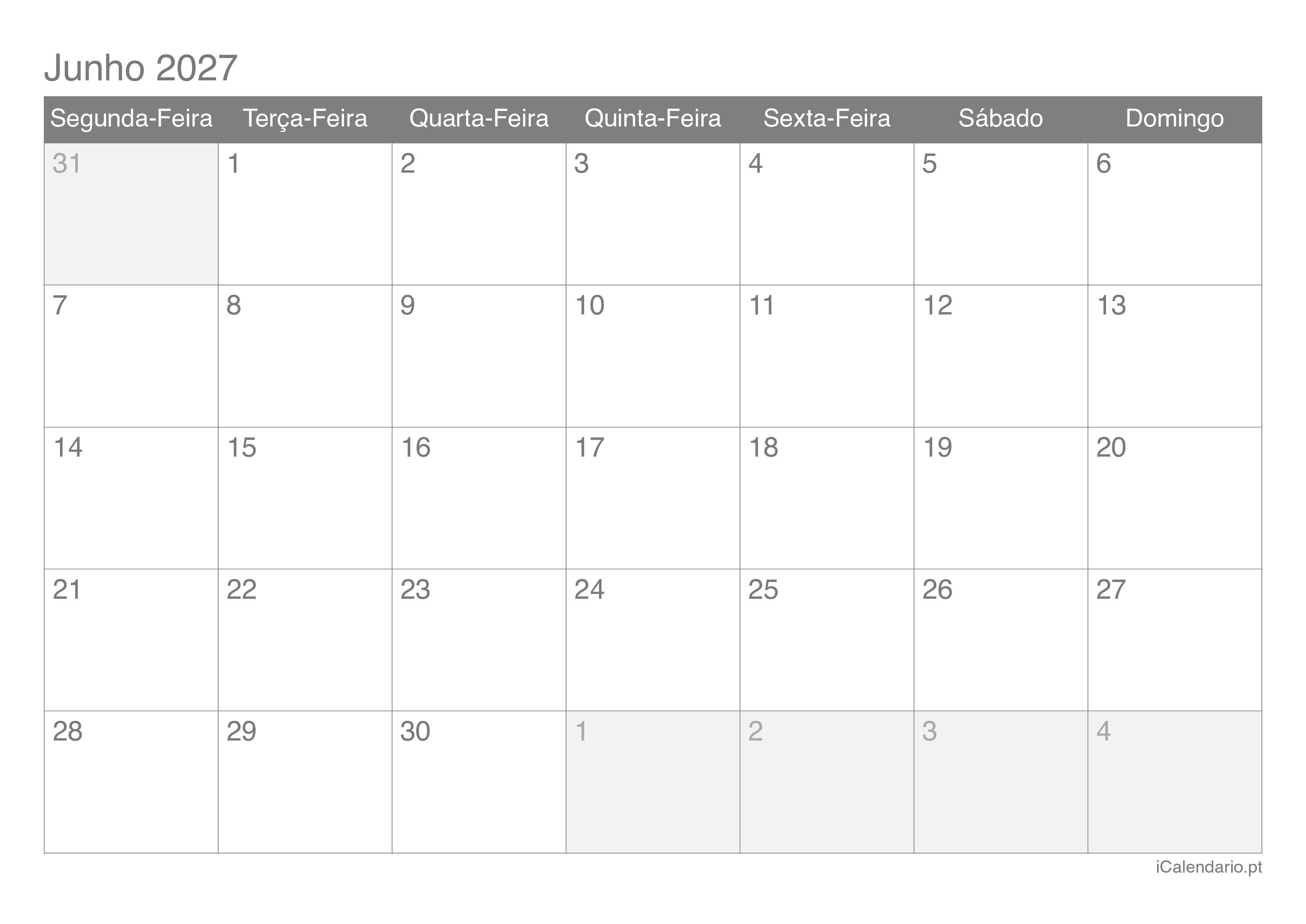 Você pode baixar e imprimir à vontade o calendário em branco do mês de junho 2027, com espaço para anotações, disponível nos formatos de imagem, PDF e Excel. Você encontrará também, outros temas para o calendário de junho 2027.