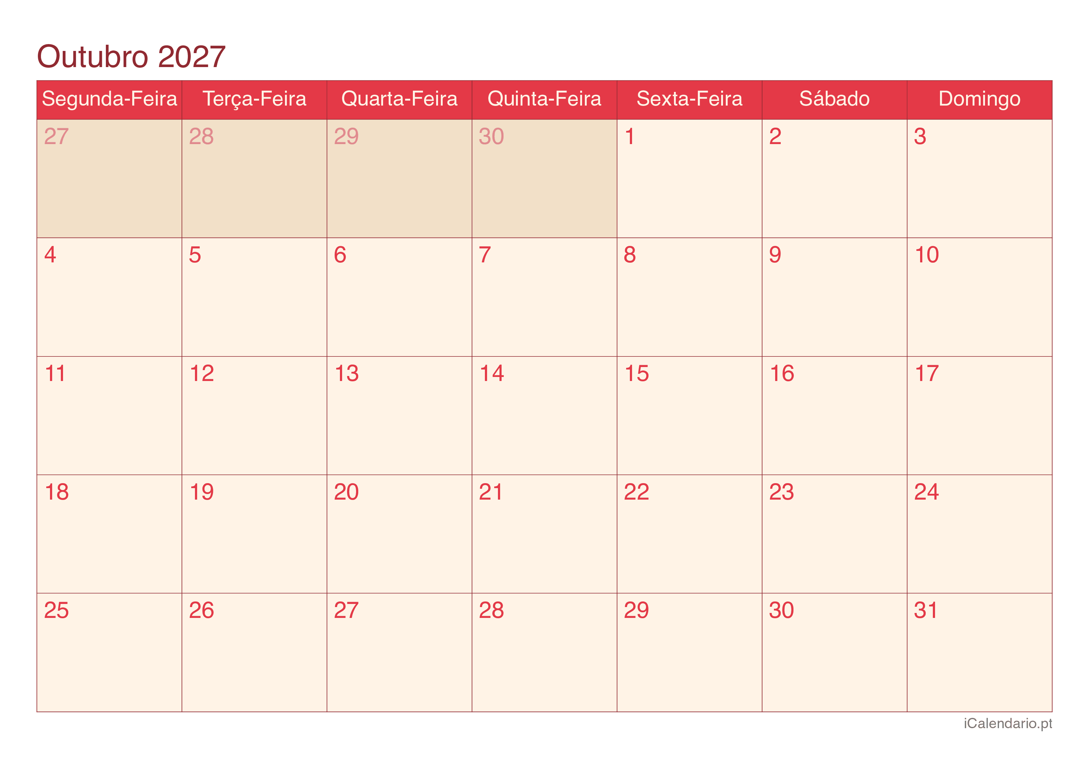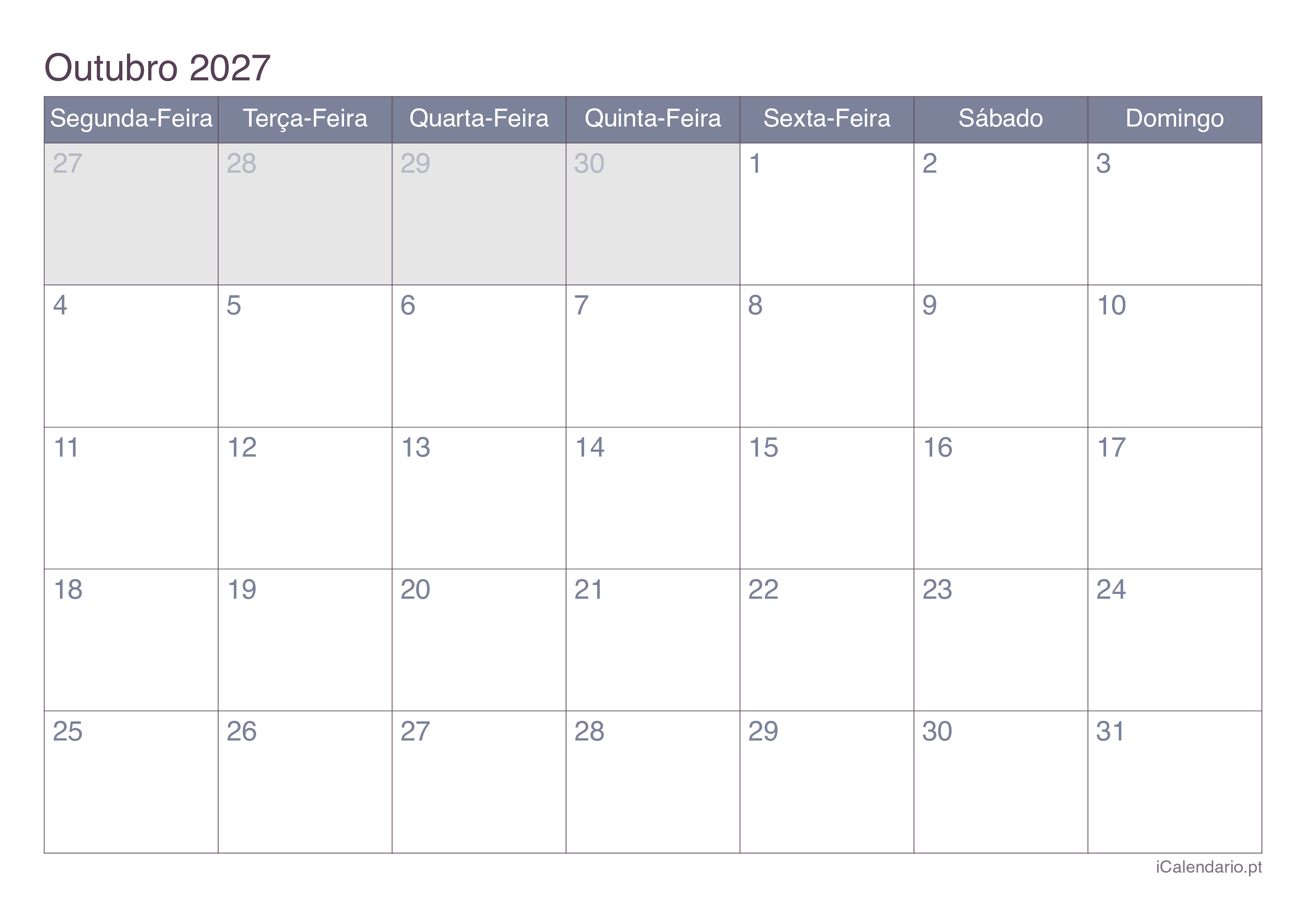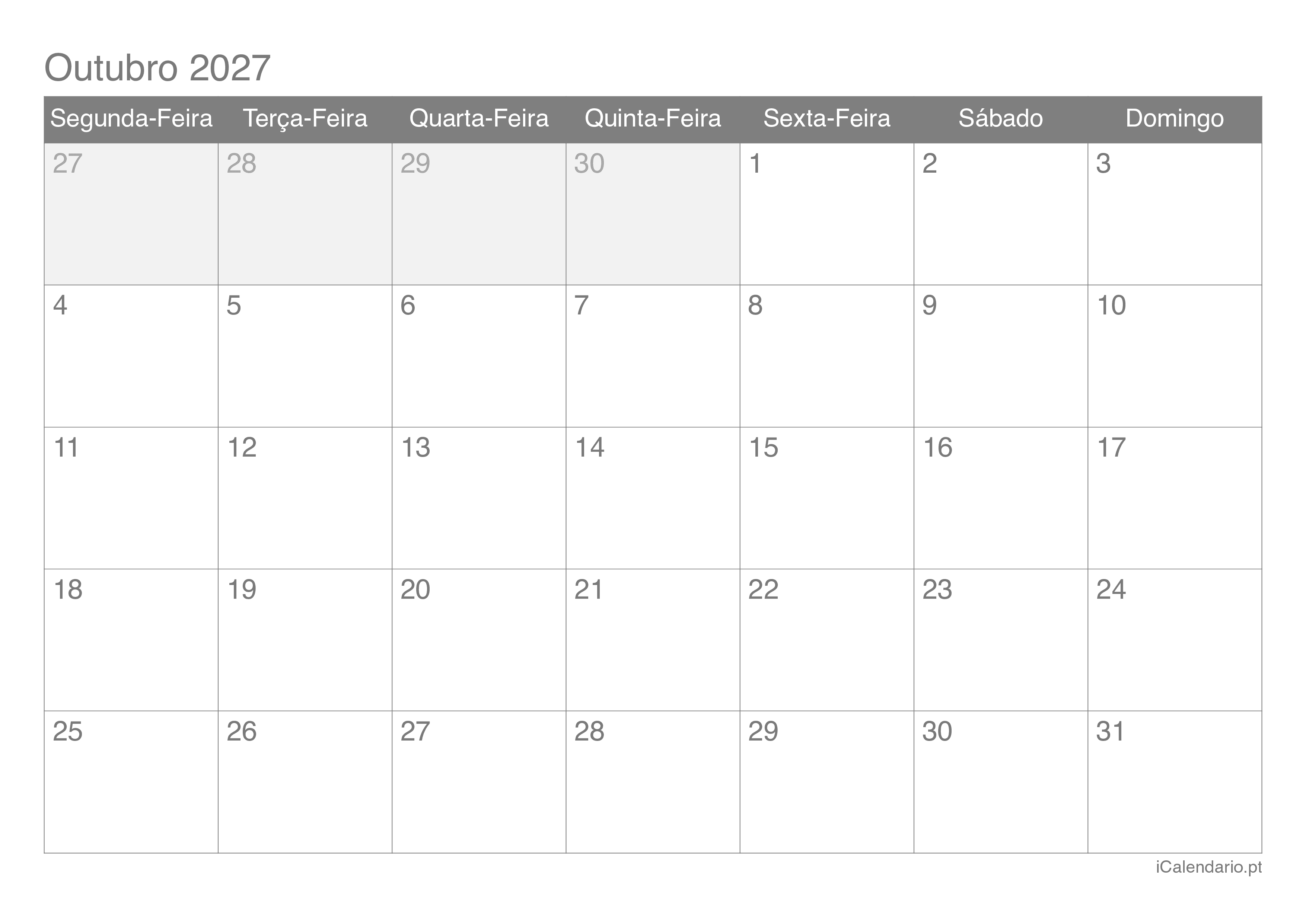 Você pode baixar e imprimir à vontade o calendário em branco do mês de outubro 2027, com espaço para anotações, disponível nos formatos de imagem, PDF e Excel. Você encontrará também, outros temas para o calendário de outubro 2027.