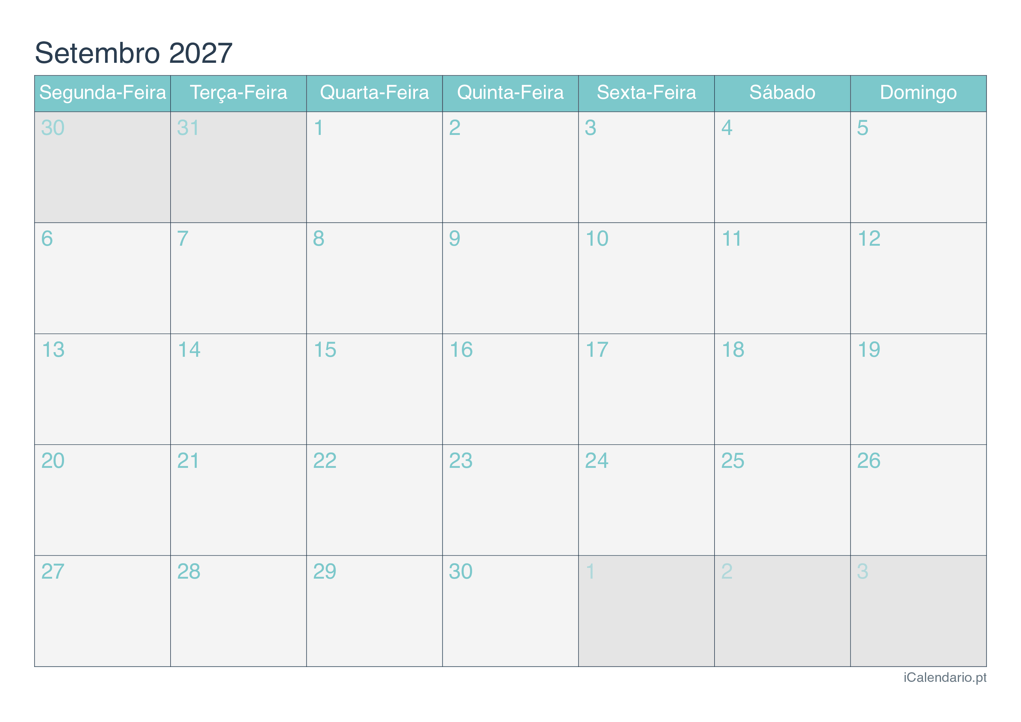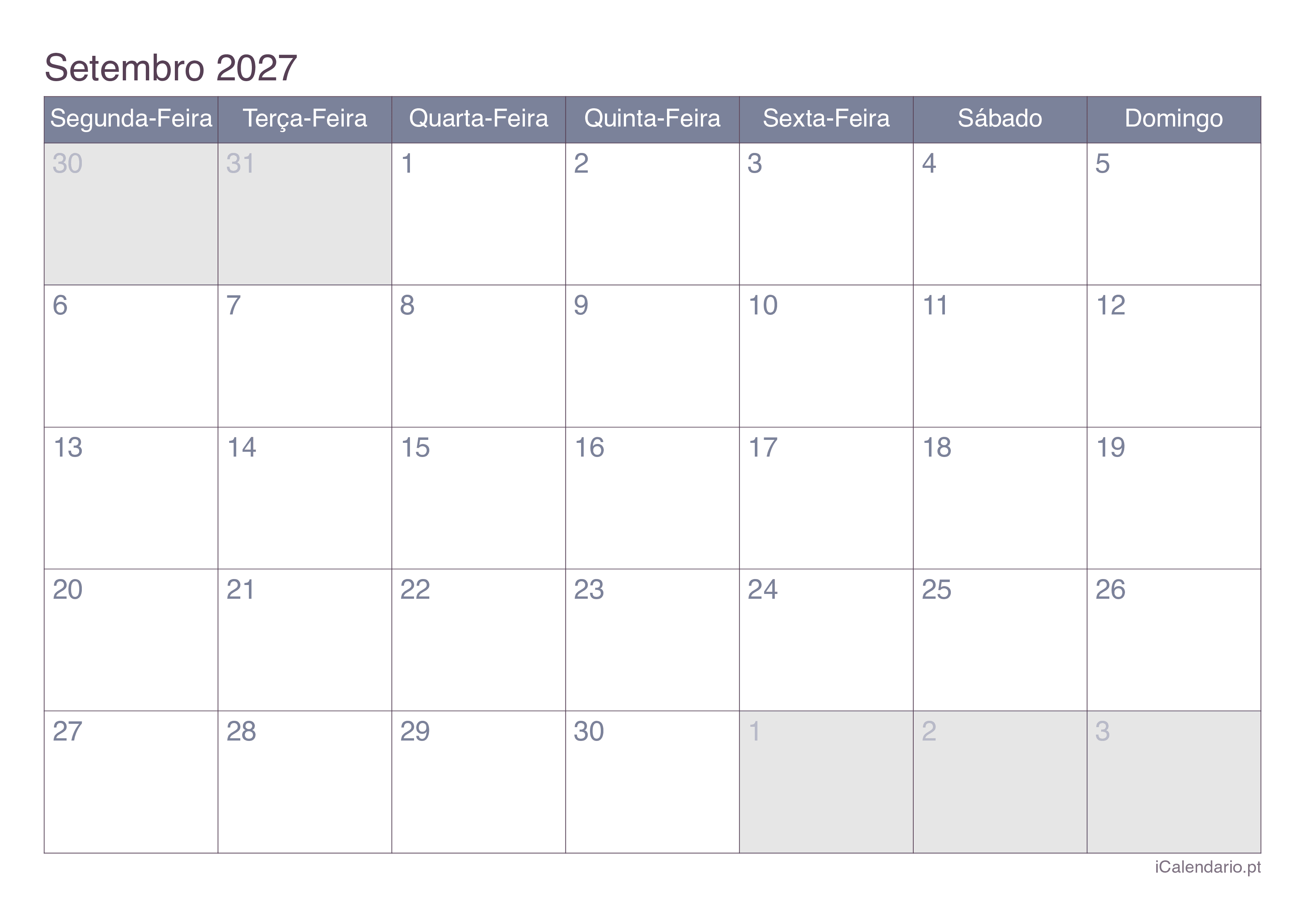 Você pode baixar e imprimir à vontade o calendário em branco do mês de setembro 2027, com espaço para anotações, disponível nos formatos de imagem, PDF e Excel. Você encontrará também, outros temas para o calendário de setembro 2027.